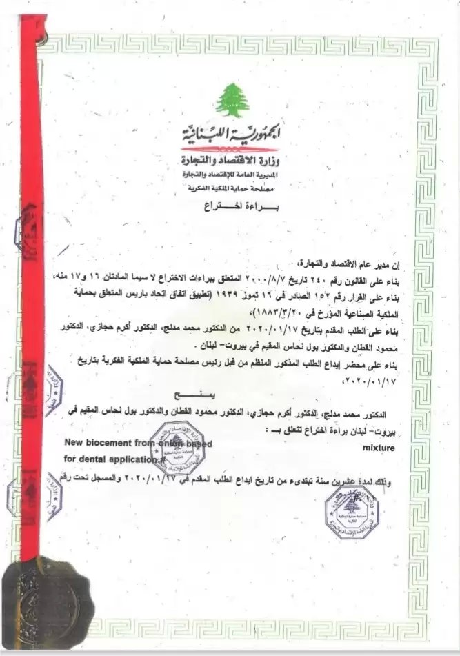 أعلنت الجامعة اللبنانية في بيان، أنها "سجلت عبر كل من الدكتور أكرم حجازي (أستاذ في كلية العلوم) والدكتور بول نحاس (أستاذ في كلية طب الأسنان) والدكتور محمود قطان (خريج كلية طب الأسنان - دفعة 2017) وطالب الدكتوراه محمد كاظم - مدلج (خريج كلية العلوم ويتابع الدكتوراه في جامعة مونبلييه الفرنسية بإشراف مشترك مع الجامعة اللبنانية)، براءة اختراع تتعلق بمادة مستخرجة من البصل تستعمل في لصق تلبيسات الأسنان على أنواعها".