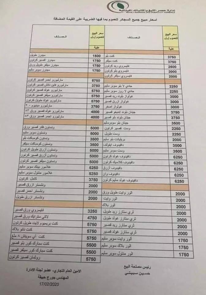 نشرت إدارة حصر التبغ والتنباك اللبنانية، أسعار مبيع أنواع السجائر، متضمنةً الضريبة على القيمة المضافة. وجاءت الأسعار على الشكل التالي وفق الجدول المرفق أدناه:
