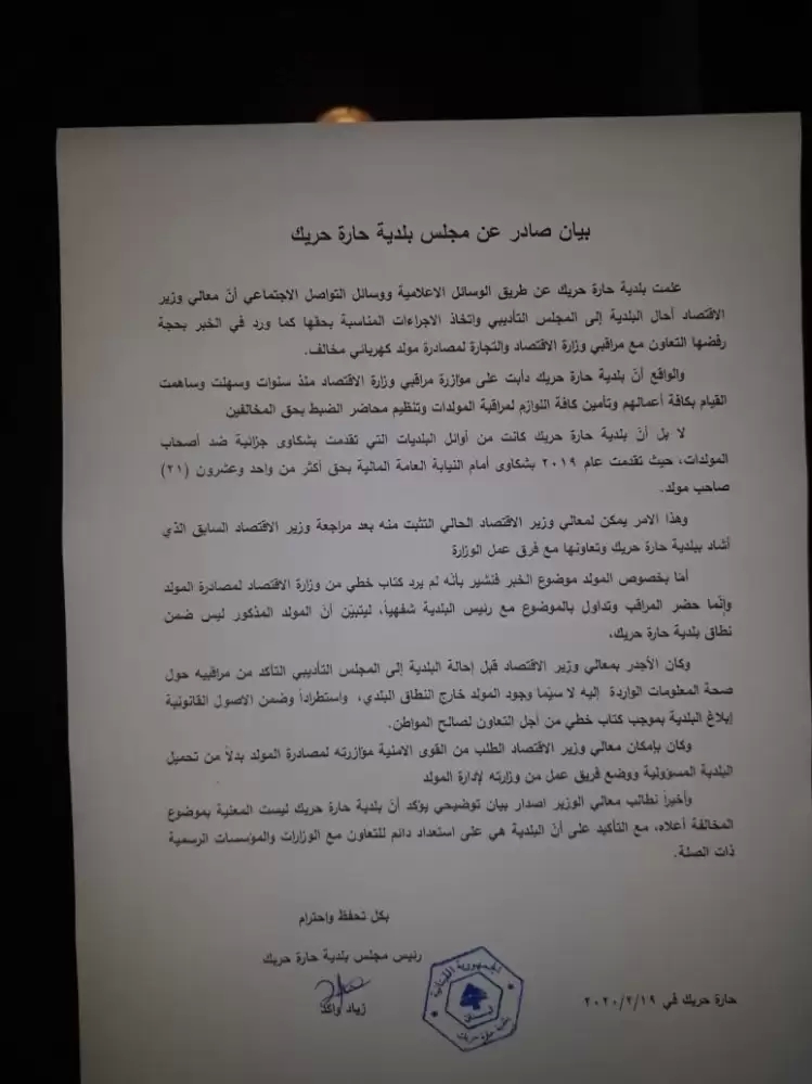 علمت بلدية حارة حريك عن طريق الوسائل الاعلامية ووسائل التواصل الاجتماعي أنّ معالي وزير الاقتصاد أحال البلدية إلى المجلس التأديبي واتخاذ الاجراءات المناسبة بحقها كما ورد في الخبر بحجة رفضها التعاون مع مراقبي وزارة الاقتصاد والتجارة لمصادرة مولد كهربائي مخالف.