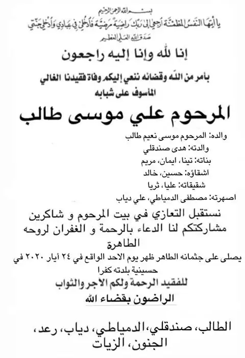 انتقل إلى رحمة الله تعالى المرحوم علي موسى طالب