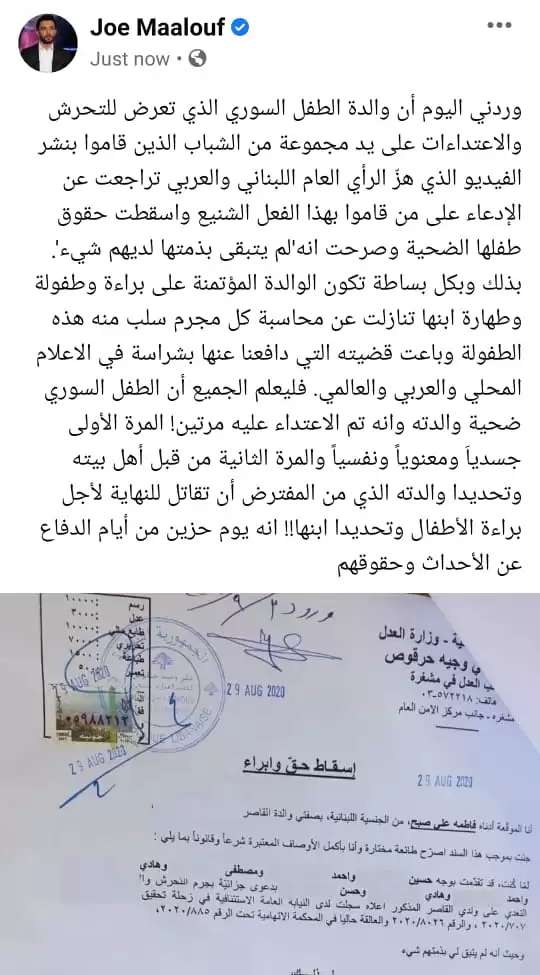 نشر الإعلامي جو معلوف عبر حسابه صورة مستند "إسقاط حق وإبراء" تقدمت به والدة القاصر الذي تعرض للإعتداء والتحرش على يد مجموعة شبان.