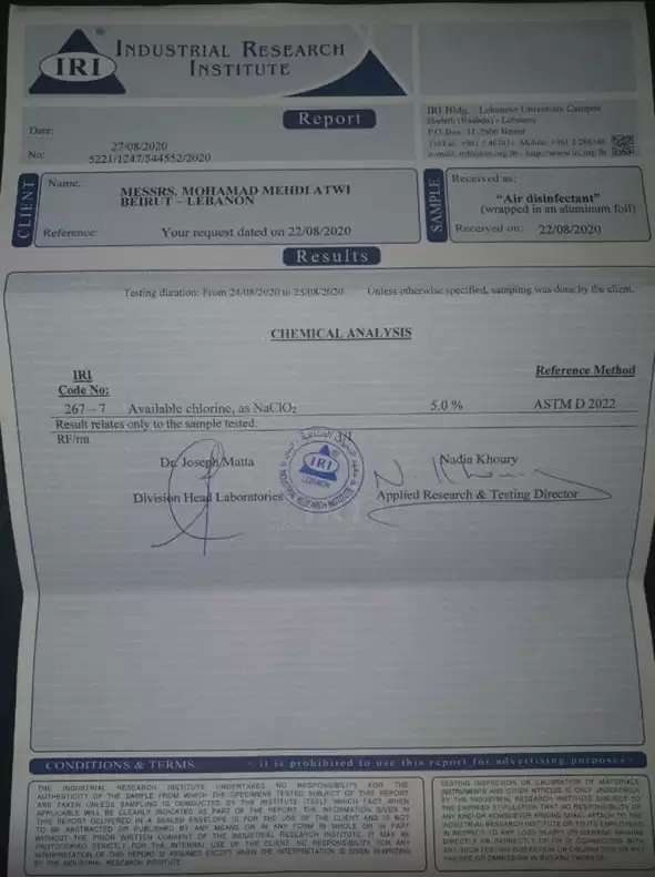 والجدير بالذكر أن الإبتكار حائز على شهادة تؤكد احتواء السوار على النسبة المطلوبة من ثاني اكسيد الكلور للتعقيم من معهد البحوث الصناعية. وبحسب ما أفاد أصحاب الإبتكار أن السوار خضع لتجارب أولية في مختبرات مجهزة وأثبت فعاليته ضد الفيروسات والبكتيريا.