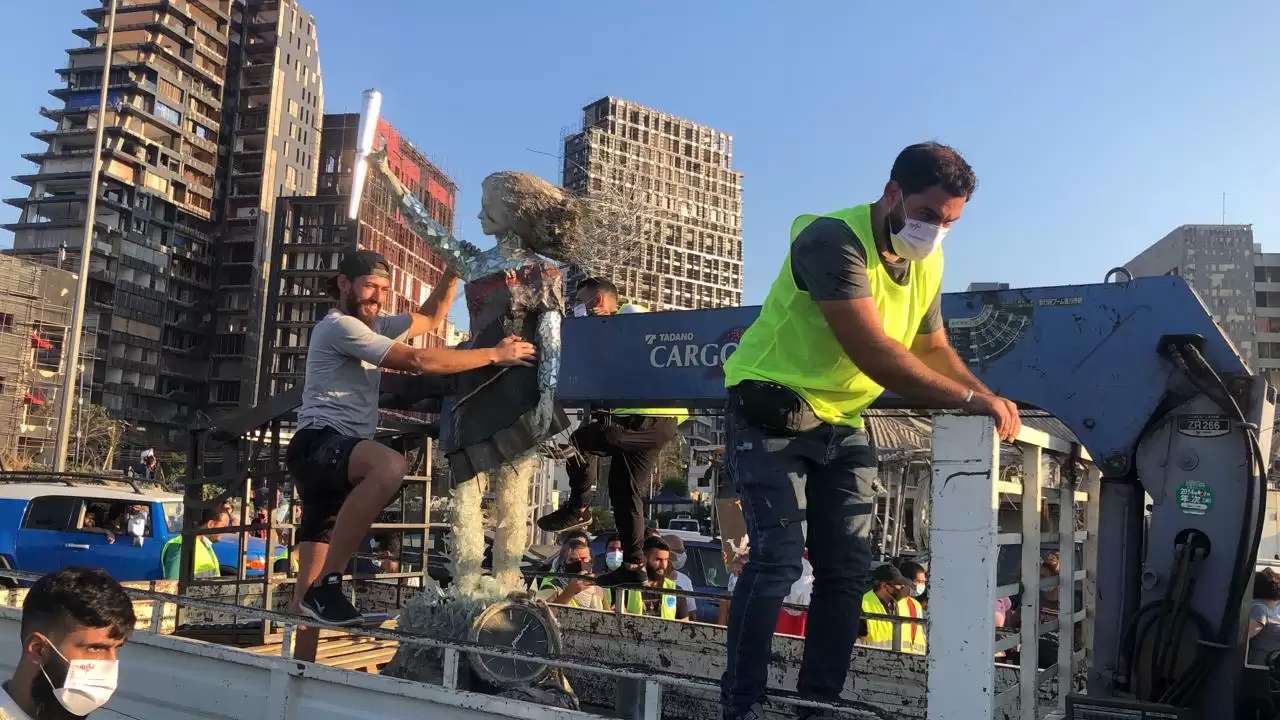 تم نصب تمثال تحت اسم "عروس الثورة" في بيروت قرب تمثال المغترب مصنوع من الزجاج المحطم جراء انفجار المرفأ.