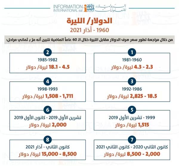 نشرت الدولية للمعلومات عبر موقعها الإلكتروني دراسة تظهر المراحل التي مرّ بها سعر صرف الليرة مقابل الدولار، وأكّدت أنّه "من خلال مراجعة تطور سعر صرف الدولار مقابل الليرة خلال الـ 60 عاماً الماضية نتبين أنه مرّ بثماني مراحل".