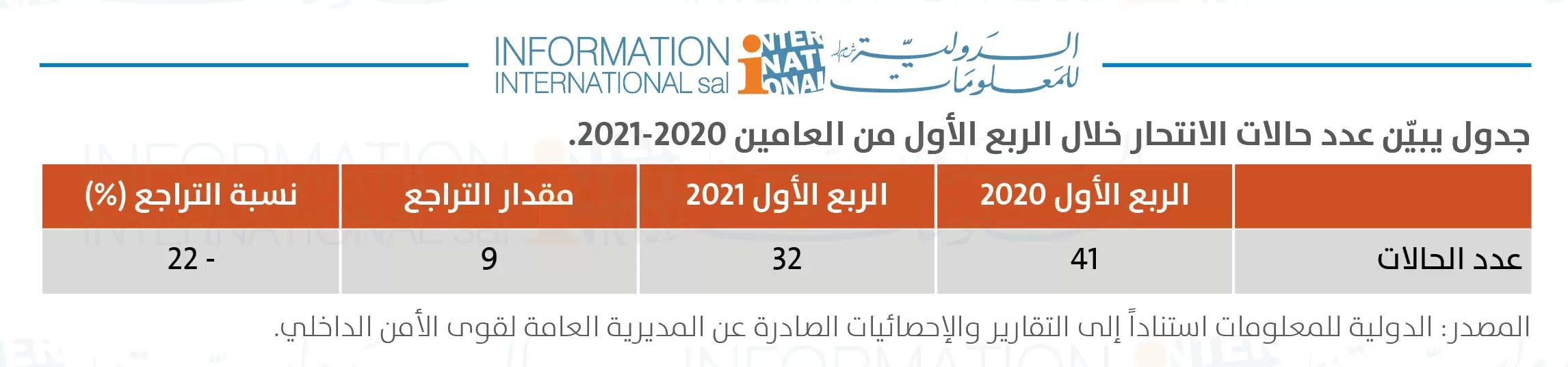 سجلت المؤشرات الأمنية في الربع الأوّل من العام الحالي، بحسب "الدولية للمعلومات"، لاسيما القتل والسرقة، ارتفاعاً مقارنة بالفترة عينها من العام 2020. لكن حالات الانتحار وحوادث السير تراجعت.