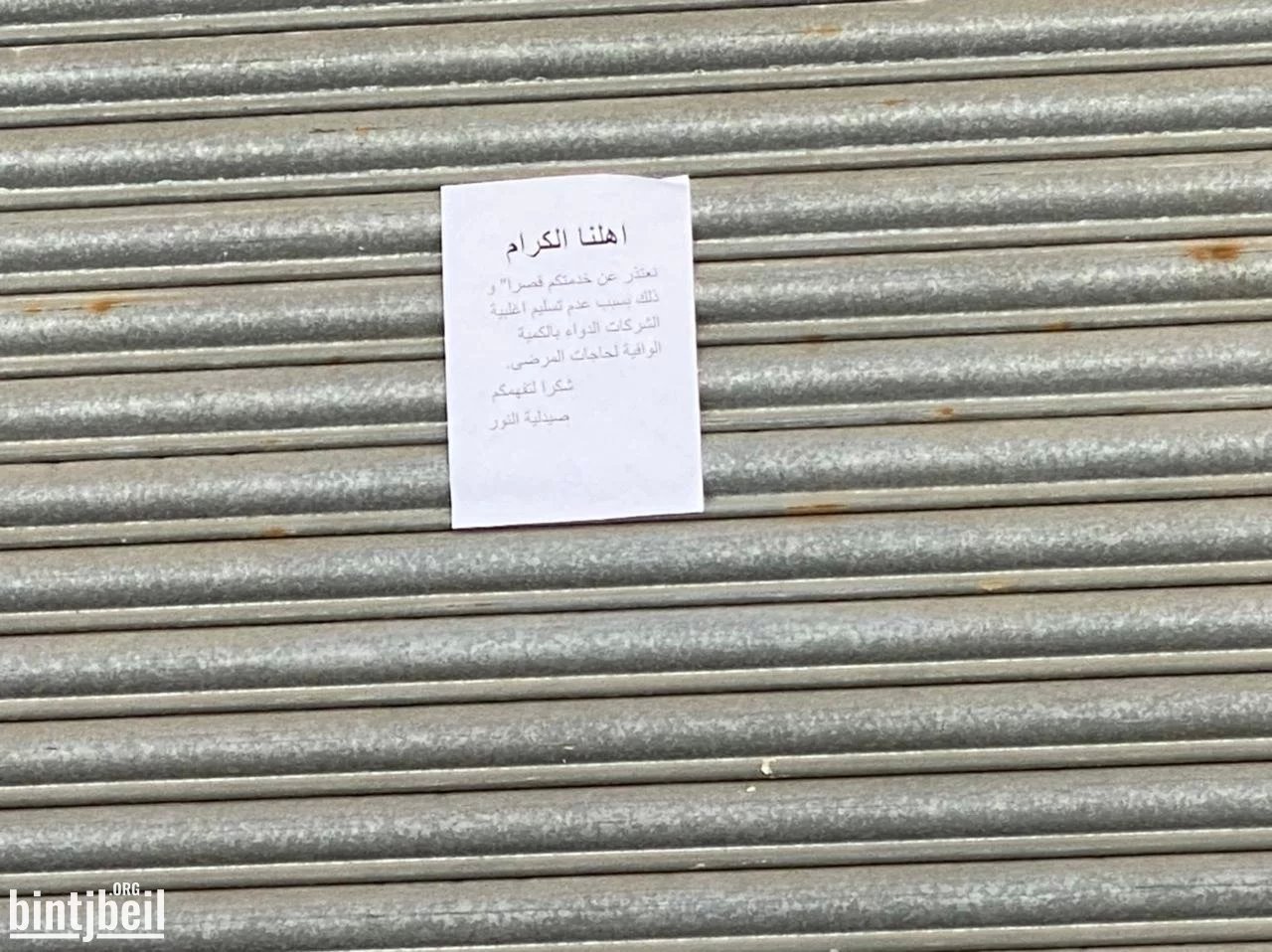 إلتزم أصحاب الصيدليات في بنت جبيل بإضراب الصيادلة وذلك احتجاجاً على الوضع المزري الذي وصل اليه الواقع الصحي والدوائي، ولمطالبة المعنيين بحلول سريعة بدعم قطاعهم ووقف الإحتكار من قبل مستوردي الأدوية والشركات.
