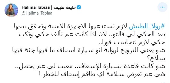 غردت الإعلامية حليمة طبيعة على حسابها عبر تويتر قائلة: "رولا الطبش لازم تستدعيها الاجهزة الامنية وتحقق معها بعد الحكي لي قالتو.. لان اذا كانت عم تألف حكي وتكب حكي لازم تتحاسب فورا.. شو يعني الترويج لرواية انو سيارة اسعاف ما فيها جثة فيها سلاح؟ شو كانت قاعدة بسيارة الإسعاف.. معيب لي عم يحصل.. هي عم تعرض سلامة اي طاقم إسعاف للخطر!".