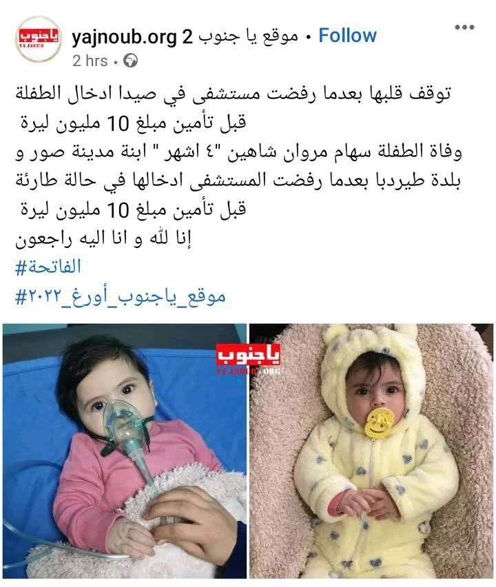 فجعت مدينة صور بوفاة الطفلة الصغيرة سهام مروان شاهين (4 أشهر ونصف) بعد تعرضها لعارض صحي مفاجئ جعلها بحاجة لغرفة للعناية الفائقة الخاصة بالأطفال.