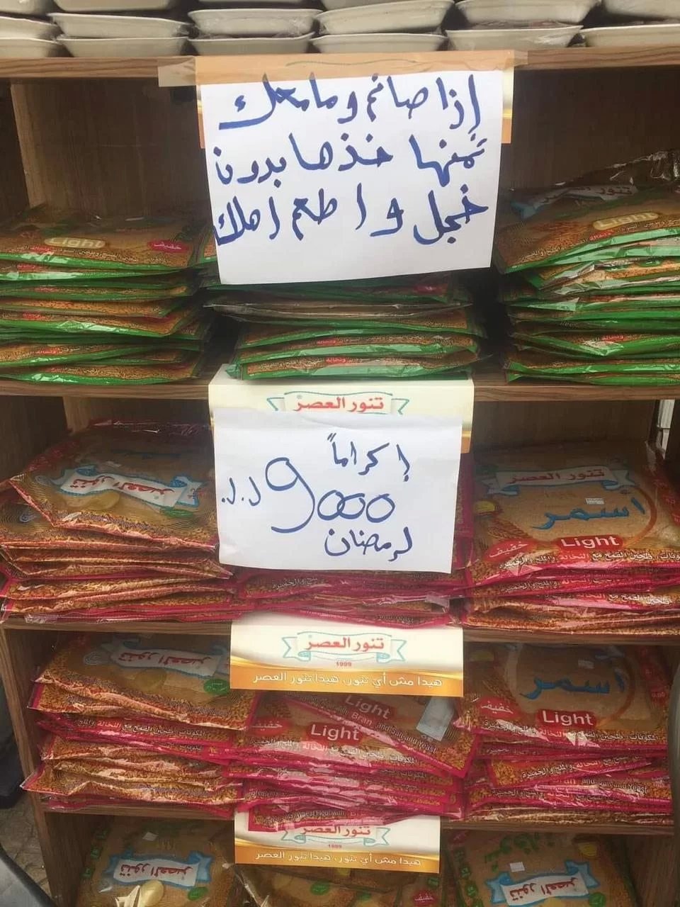 في مبادرة لافتة، إنتشر عبر مواقع التوصل الإجتماعي صورة لورقة عُلقت في أحد المحلات في طرابلس: "إذا صائم وما معك ثمنها خذها بدون خجل واطعم أهلك".