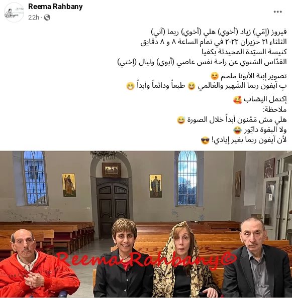 تواصل المخرجة اللبنانيّة ريما الرحباني نشر صور من القداس السنوي عن راحة نفس والدها الراحل عاصي الرحباني وشقيقتها الراحلة ليال، والّذي شارك فيه كلّ من والدتها السيدة فيروز وشقيقيها هلي وزياد الرحباني.