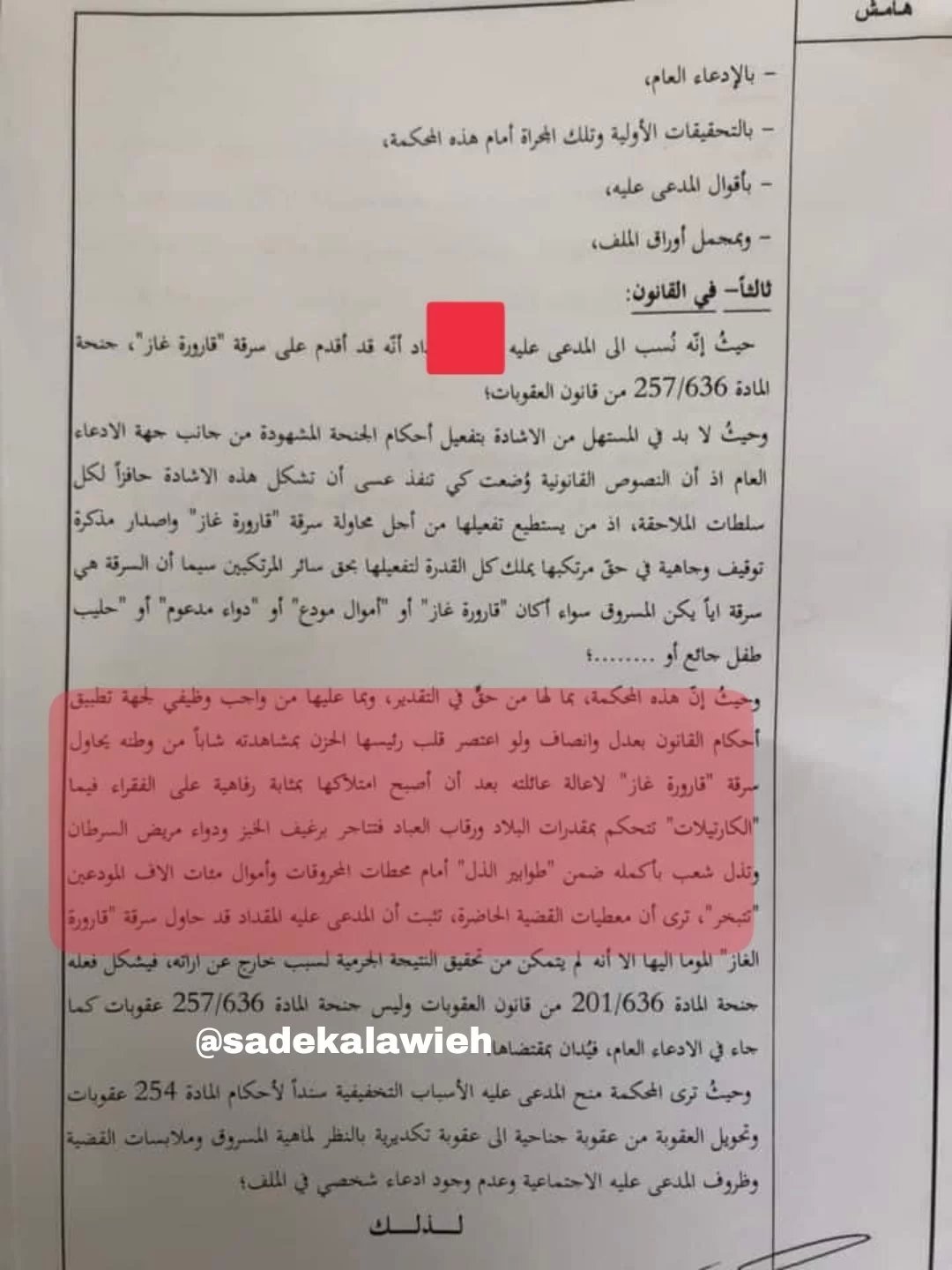كشف عضو المجلس الاقتصادي والاجتماعي والبيئي صادق علويَّة عبر حسابه على تويتر أن: القاضي المنفرد الجزائي في بعبدا شادي قردوحي يقرر الاكتفاء بحبس متهم بسرقة قنينة غاز 5 أيام فقط.. وقد ورد في الحكم : "اعتصر قلب رئيس المحكمة الحزن بمشاهدته شاباً من وطنه يحاول سرقة "قارورة غاز" لإعالة عائلته بعد أن أصبح امتلاكها بمثابة رفاهية على الفقراء..".