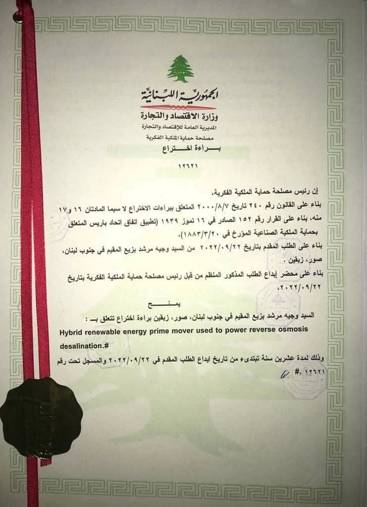 حاز إبن بلدة زبقين في قضاء صور المهندس وجيه مرشد بزيع على براءة إختراع من وزارة الإقتصاد والتجارة في مجال الطاقه المتجددة. وعمل بزيع على ابتكار وتصميم محرك هجين (hybrid renewable energy prime mover) يعمل على دمج ثلاث مصادر من الطاقه المتجددة (طاقه أمواج البحر + طاقه الرياح + الطاقه الشمسية) في نظام ميكانيكي لتشغيل محطة تحليه مياه البحر ويمكن تشغيل هذا المحرك في تطبيق آخر.