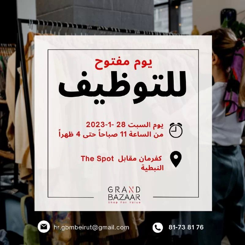 يعلن غراند بازار عن يوم مفتوح لاستقبال طلبات التوظيف في النبطية، ضمن المجالات التالية: موظف/ة مبيعات أمين/ة صندوق موظف مستودع مُلِم/ة وسائل التواصل الإجتماعي مساعد/ة مدير
