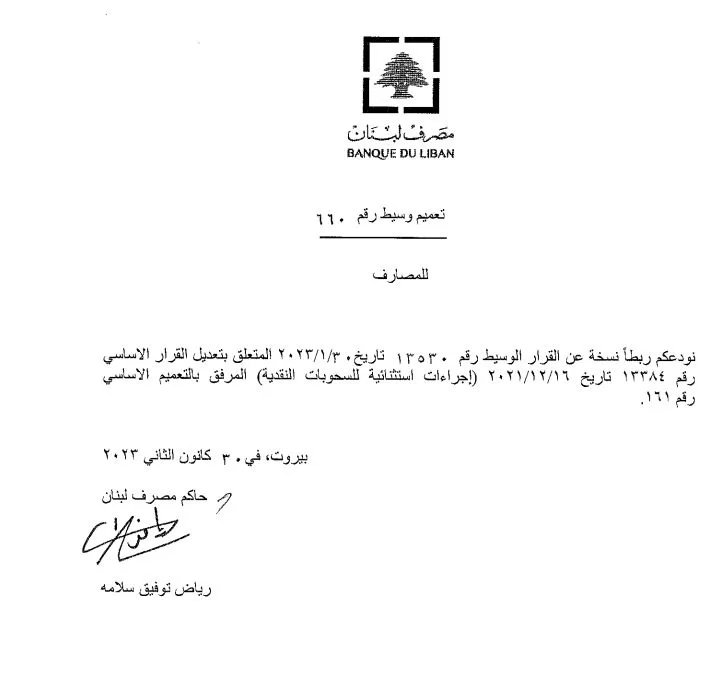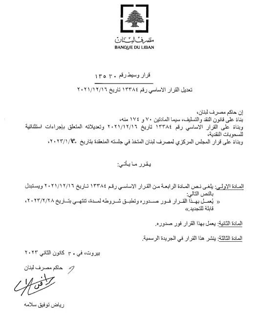 صدر عن مصرف لبنان تعميم وسيط رقم 660، الى المصارف، أرفقه بنسخة عن القرار الوسيط رقم 13530 تاريخ 30/1/2023، المتعلق بتعديل القرار الاساسي رقم 13384 تاريخ 16/12/2021( اجراءات استثنائية للسحوبات النقدية) المرفق بالتعميم الاساسي رقم 161.