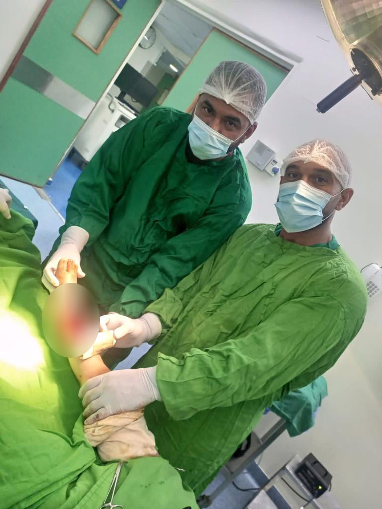 يتابع الدكتور علاء: كان التحدي كبيرًا، والإصرار كان بإعادة ساق علي وتمكينه من السير مجدّدًا، البارحة ختمنا العمل الجراحي بزرع جلدٍ مكان العملية وبإذنه تعالى سيتمكن علي وخلال فترة قصيرة من المشي...