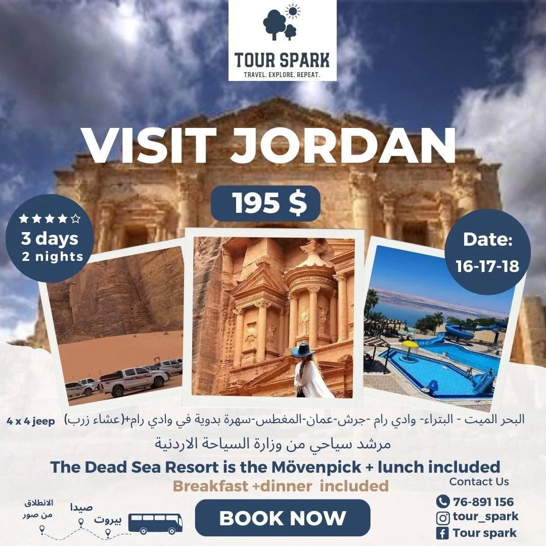 احجزوا مقاعدكم لرحلة سياحية من لبنان إلى الأردن بأفضل سعر من Tour Spark. استكشفوا أبرز الأماكن الأثرية برفقة مرشد سياحي من وزارة السياحة الأردنية.