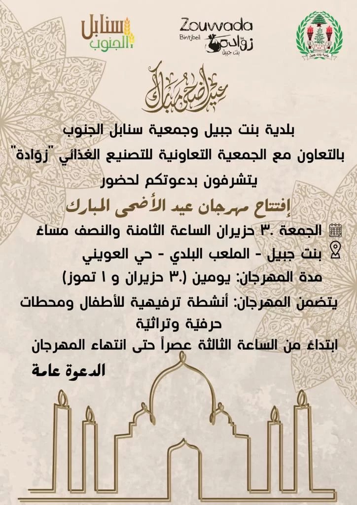 بلدية بنت جبيل وجمعية سنابل الجنوب بالتعاون مع الجمعية التعاونية للتصنيع الغذائي "زوادة" يتشرفون بدعوتكم لحضور إفتتاح مهرجان عيد الأضحى المبارك