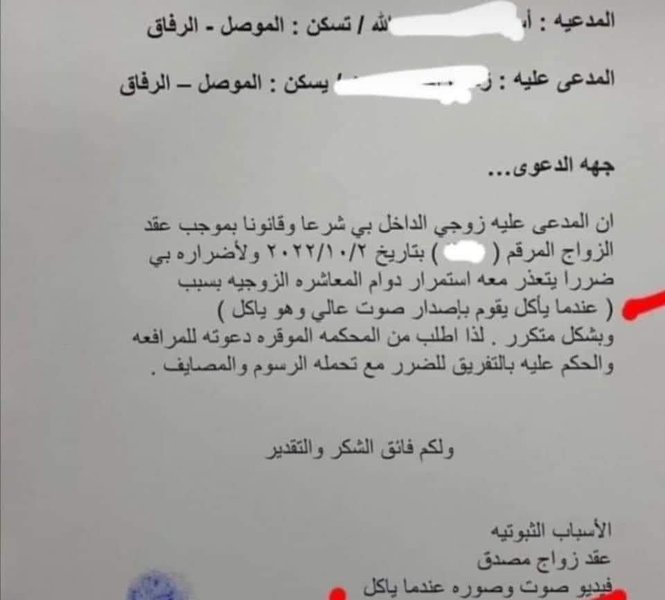 رفعت امرأة في مدينة الموصل العراقية دعوى طلاق على زوجها بسبب صوته العالي أثناء الأكل.