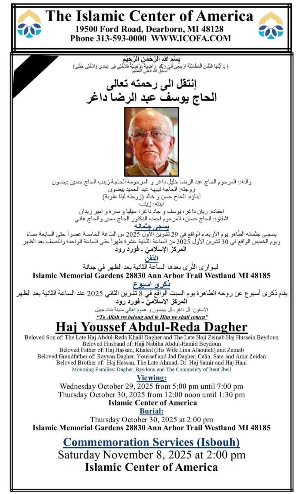 مراسم تشييع وذكرى الأسبوع المرحوم الحاج يوسف عبد الرضا داغر في أميركا