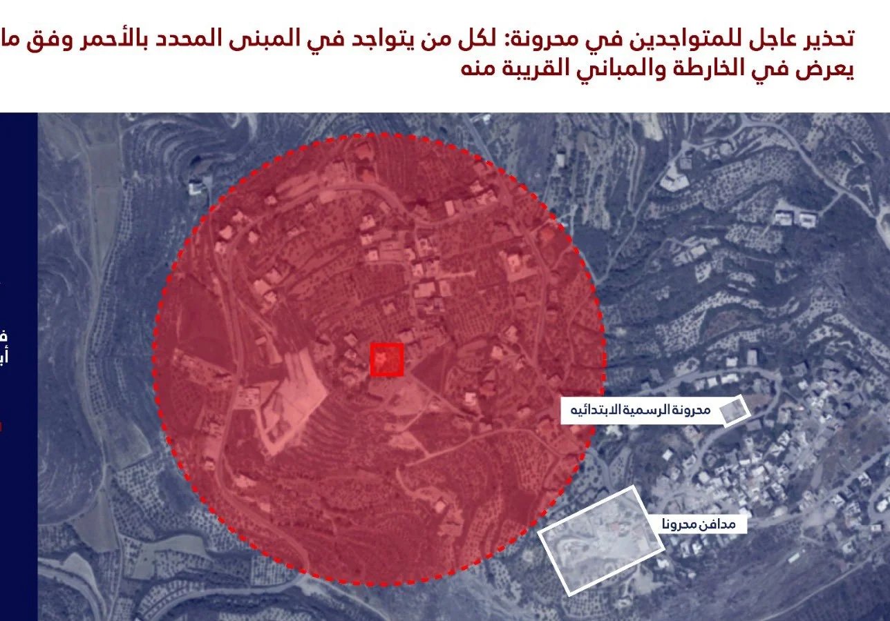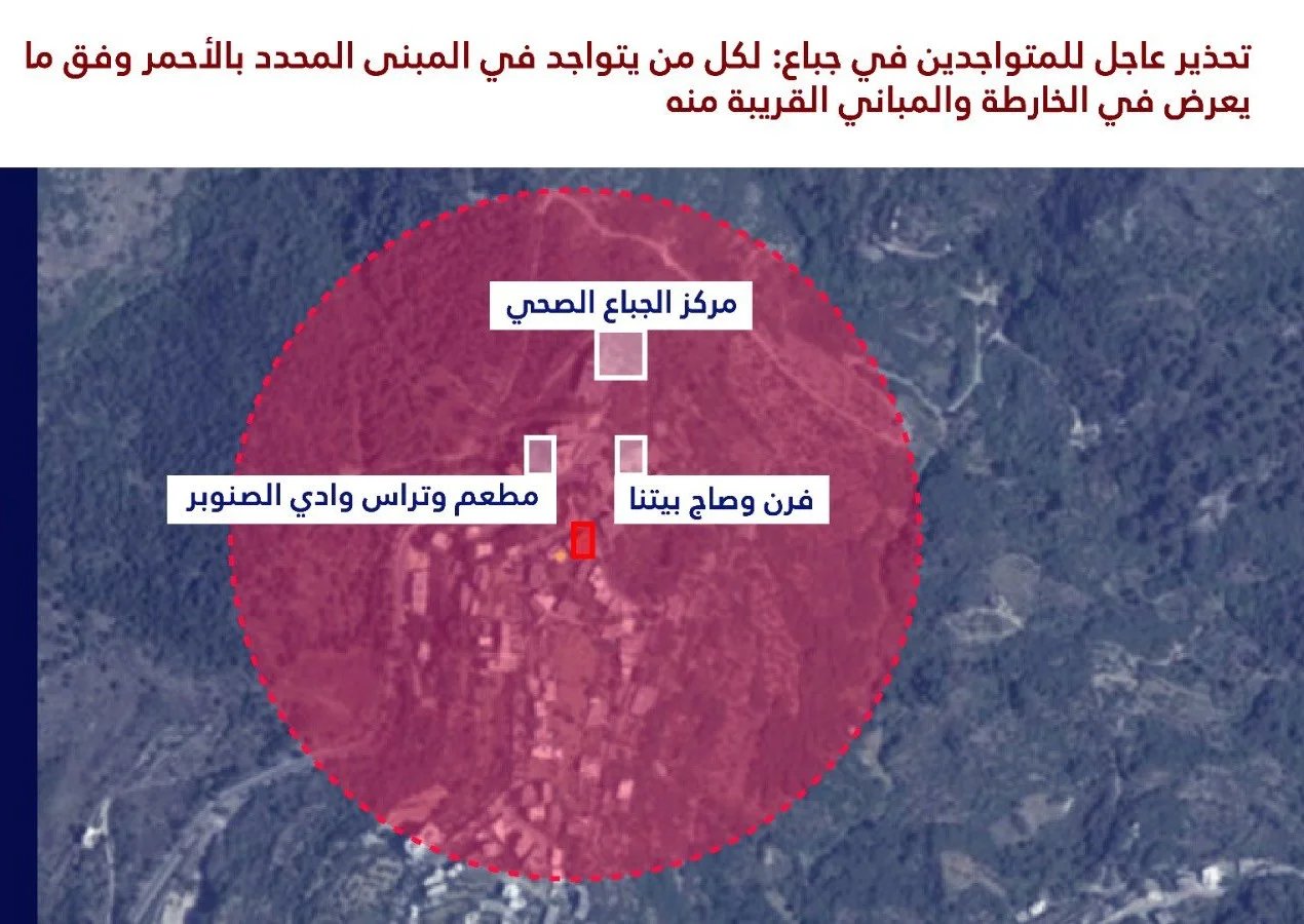 وجه المتحدث بلسان جيش العدو الاسرائيلي افيخاي ادرعي تهديدا إلى سكان بلدتي جباع ومحرونة وحدد باللون الاحمر المباني التي سيتم استهدافها.