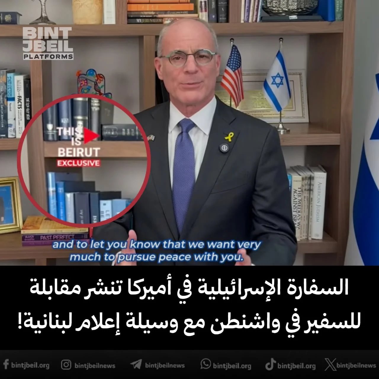 نشر حساب سفارة "إسرائيل" في أميركا مقتطفا من مقابلة للسفير الإسرائيلي في واشنطن، يحيئيل لايتر، مع وسيلة إعلامية لبنانية تدعى "This Is Beirut". وتوجه السفير خلالها مباشرة إلى الشعب اللبناني: "هناك الكثير مما يمكننا أن نفعله معا فلماذا نسمح للجهات المتطرفة بأن تقف في طريقنا؟.. نحن لا نريد العمل ضد لبنان لا نريد إصابة مدنيين". وختم: "فلنصل جميعا كي يكون عام 2026 عاما لاتفاقات إبراهيم 2.0"!