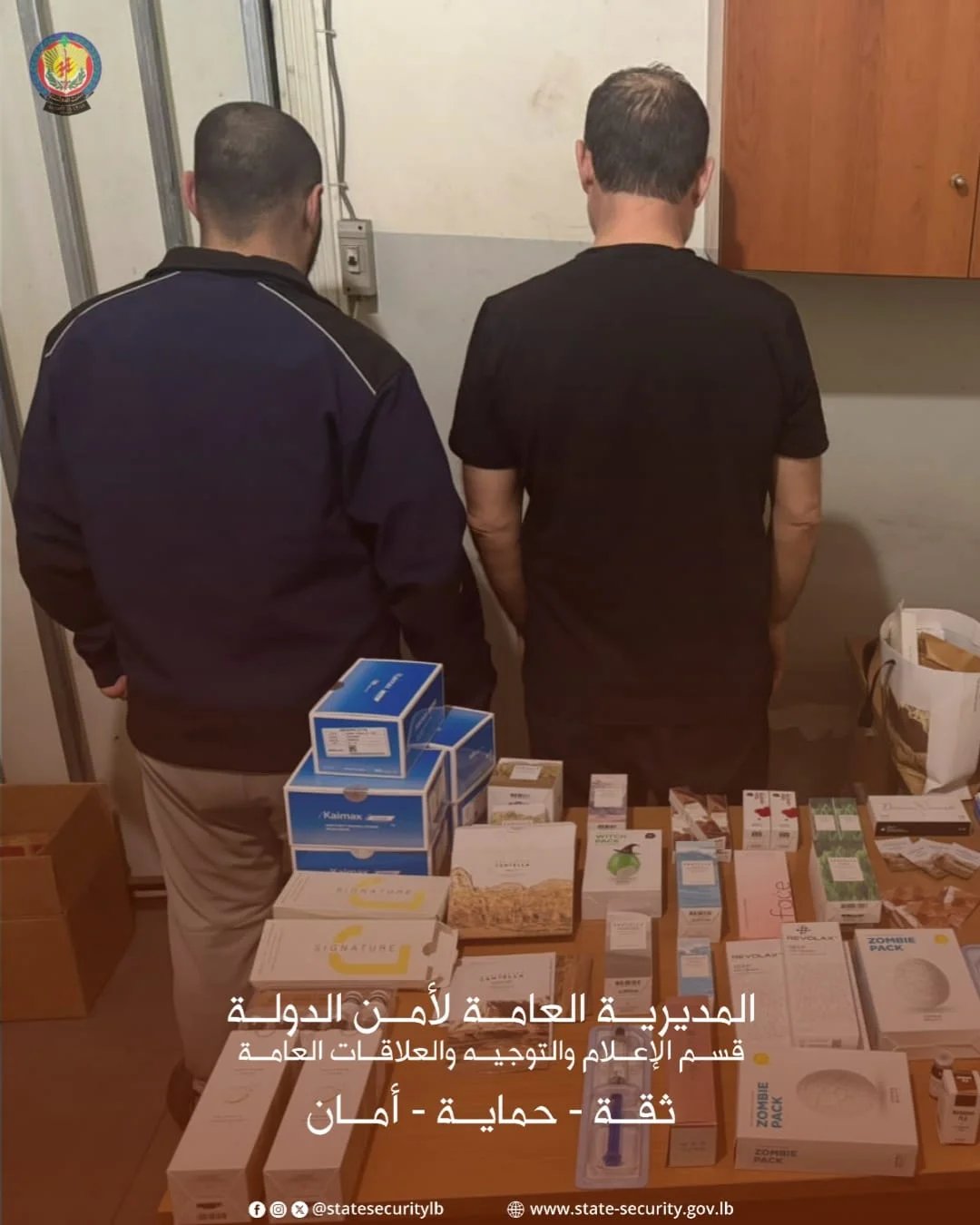 صدر عن المديرية العامة لأمن الدولة – قسم الإعلام والتوجيه والعلاقات العامة، البيان الآتي: متابعةً لجهودها في حماية الصحة العامة ولدرء المخاطر الناتجة عن عمليات التجميل غير القانونية، أوقفت دورية من مديرية جبل لبنان الاقليمية – مكتب بعبدا ، في محلة الحازمية منتحل صفة طبيب تجميل ، اللبناني (ع.ك.) ، لقيامه بعشرات عمليات التجميل وحقن البوتوكس والفيلر باستخدام مستحضرات طبية مزورة ومقلدة، ما يشكل خطرًا على سلامة المواطنين.