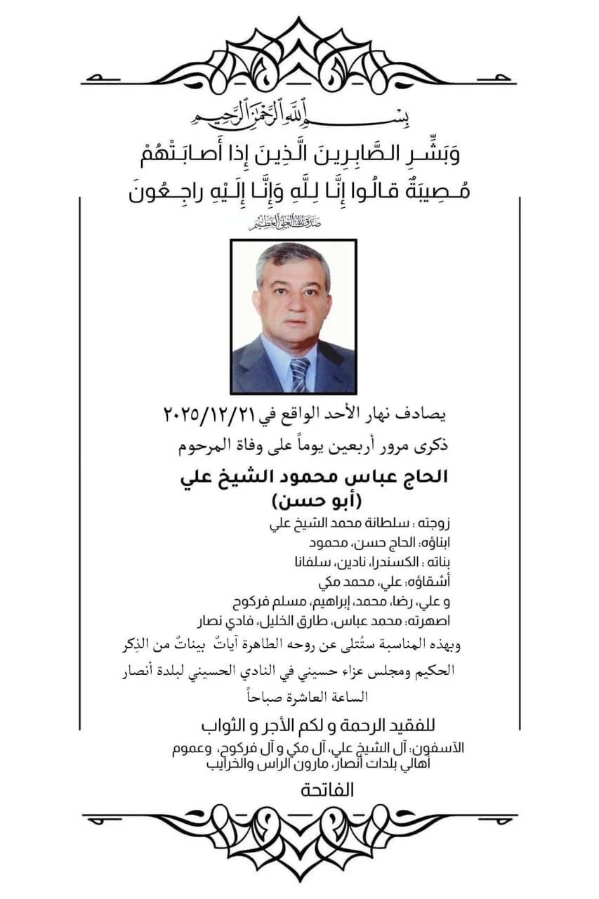ذكرى مرور أربعين يوماً على وفاة المرحوم الحاج عباس محمد الشيخ علي (أبو حسين)