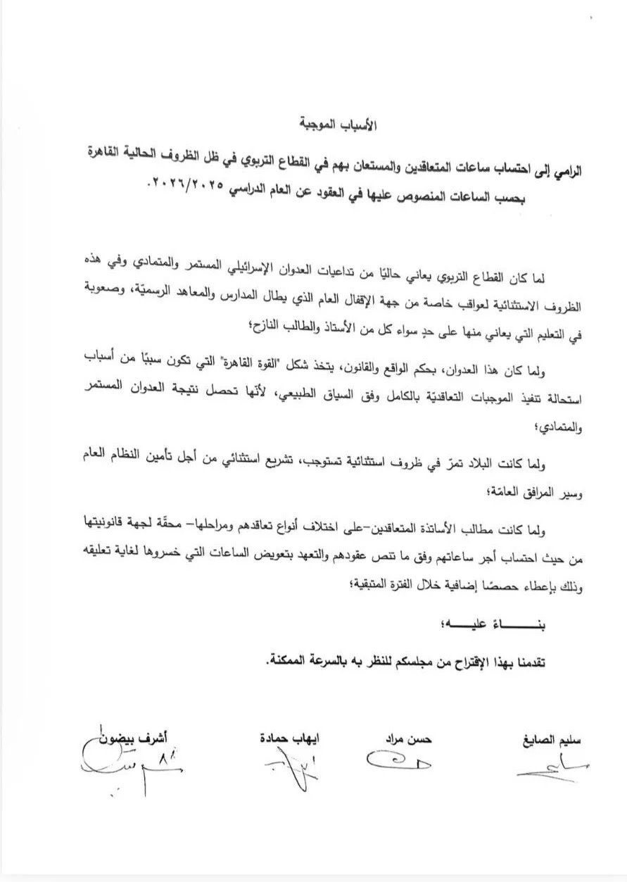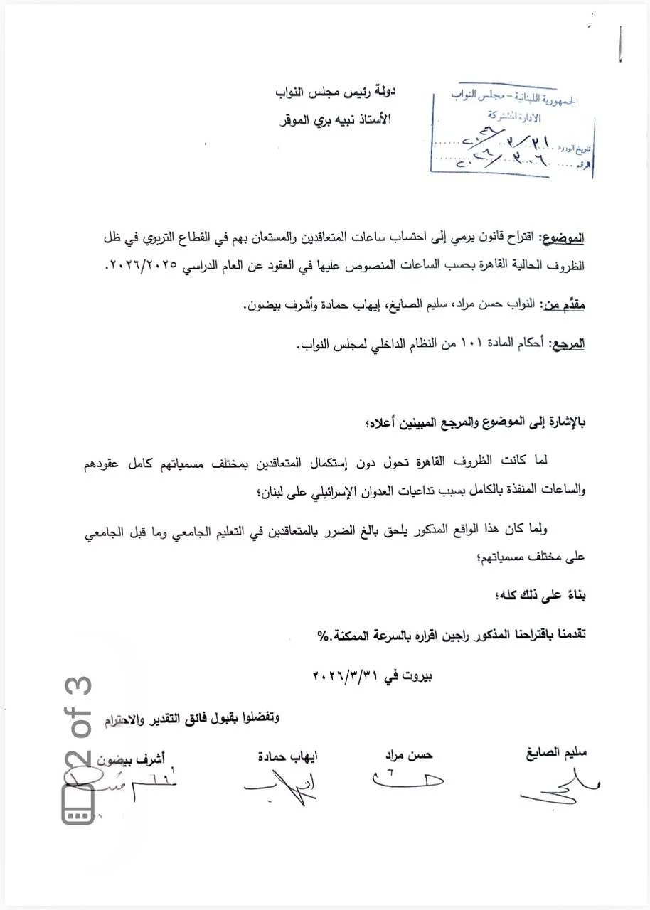 تقدّم النواب أشرف بيضون، حسن مراد، سليم الصايغ، ايهاب حمادي وبلال الحشيمي باقتراح قانون يرمي إلى احتساب كامل ساعات العقد للمتعاقدين (بمختلف مسمياتهم) الجامعي وما قبل الجامعي والمستعان بهم نظرًا للظروف الاستثنائية والقاهرة التي يمر بها الأستاذ والطالب على حد سواء.